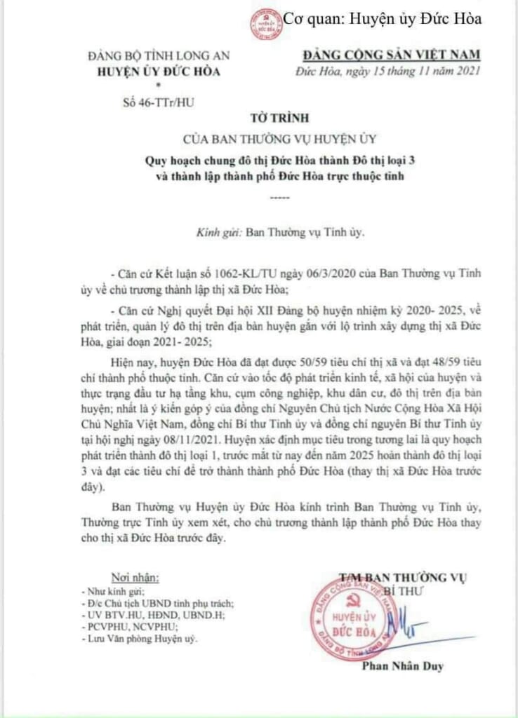 Và mới đây nhất, ngày 15/11/2021 ban thường vụ huyện ủy Đức Hòa đã đưa ra quy hoạch chung đô thị Đức Hòa thành đô thị loại 3 và thành lập thành phố Đức Hòa