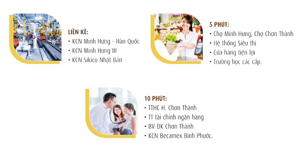 Phúc Hưng Golden tọa lạc tại giao lộ ” Vàng” đại lộ Minh Hưng và đường phía Tây Quốc Lộ 13. Tiếp giáp trực tiếp QL13, QL14, cao tốc Tân Vạn – Hoa Lư, đường sắt Xuyên Á. Là tâm điểm kết nối giao thương giữa các tỉnh Đông Nam Bộ, Tây Nguyên và nước bạn Campuchia. Với vị trí này, chưa đến 60 phút dễ dàng di chuyển đến TP.HCM, Bình Dương, Đồng Nai, TP Đồng Xoài, Tây Ninh,…với mạng lưới giao thông khá đồng bộ và hiện đại.