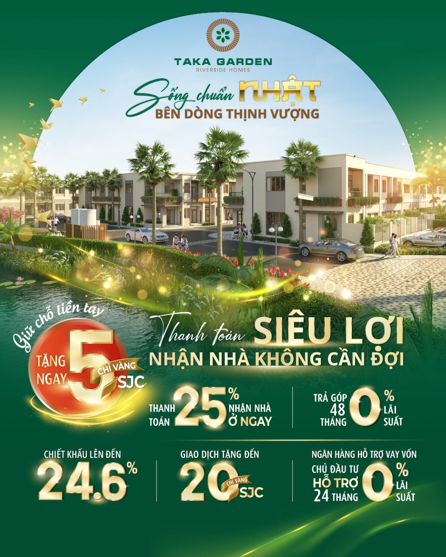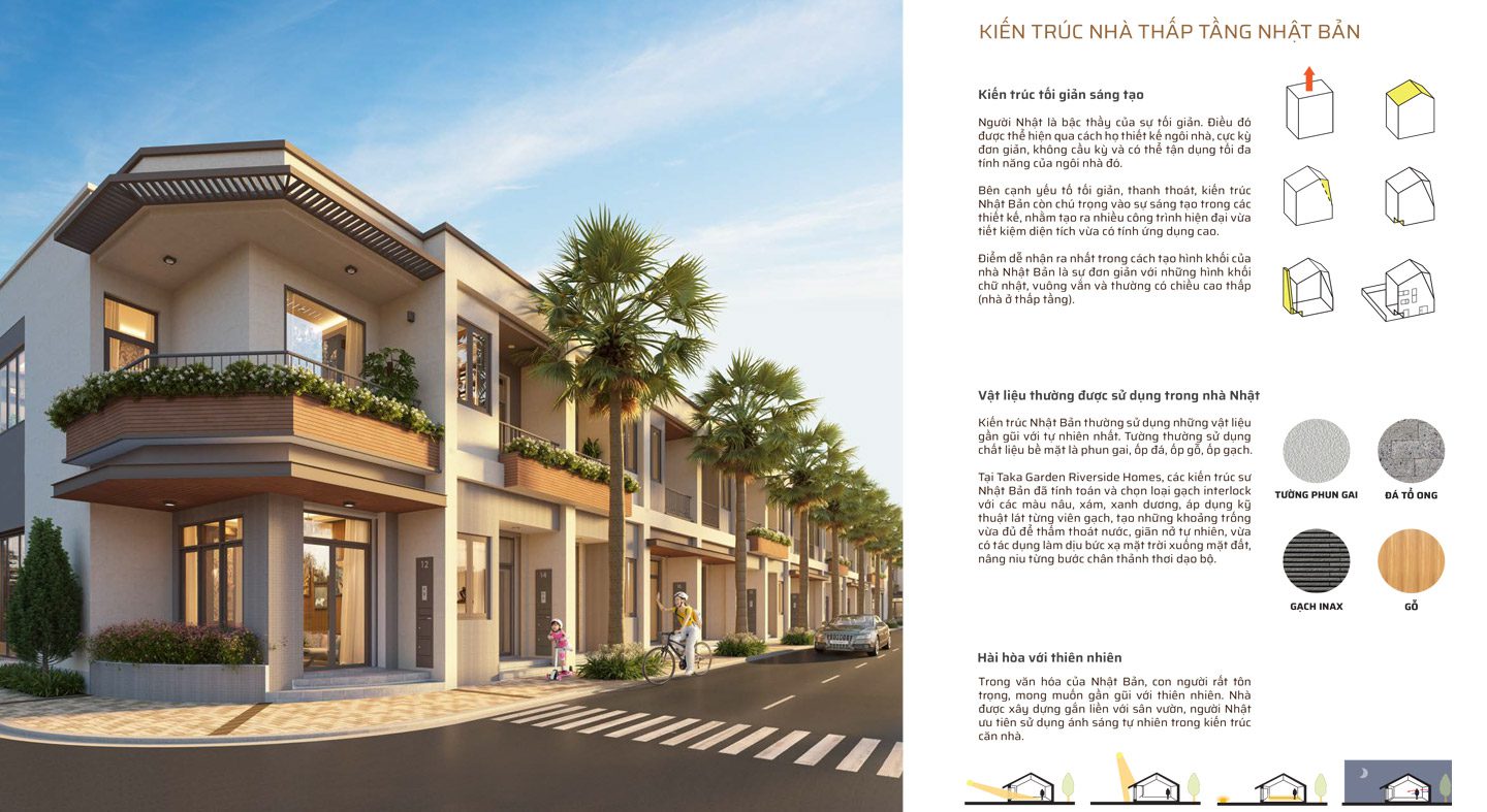 Nhà phố tại Taka Garden sở hữu phong cách thiết kế tinh tế, tối giản, đa năng; đồng thời khéo léo kết hợp thiên nhiên, văn hoá bản địa hoà cùng dấu ấn Nhật. Với không gian sang trọng, thanh lịch, số lượng giới hạn, nhà phố Taka Garden là lựa chọn xứng tầm của những chủ nhân danh giá.