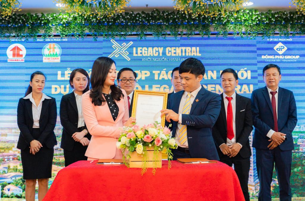 Bà Nguyễn Ngọc Ánh, Phó Tổng Giám Đốc Công Ty Cổ Phần Tập Đoàn Địa Ốc Kim Oanh trao chứng nhận đối tác phân phối chính thức Dự án Legacy Central cho Ông Đoàn Xuân Hải Tổng Giám Đốc Công Ty Cổ Phần Tập Đoàn Bất Động Sản Đồng Phú